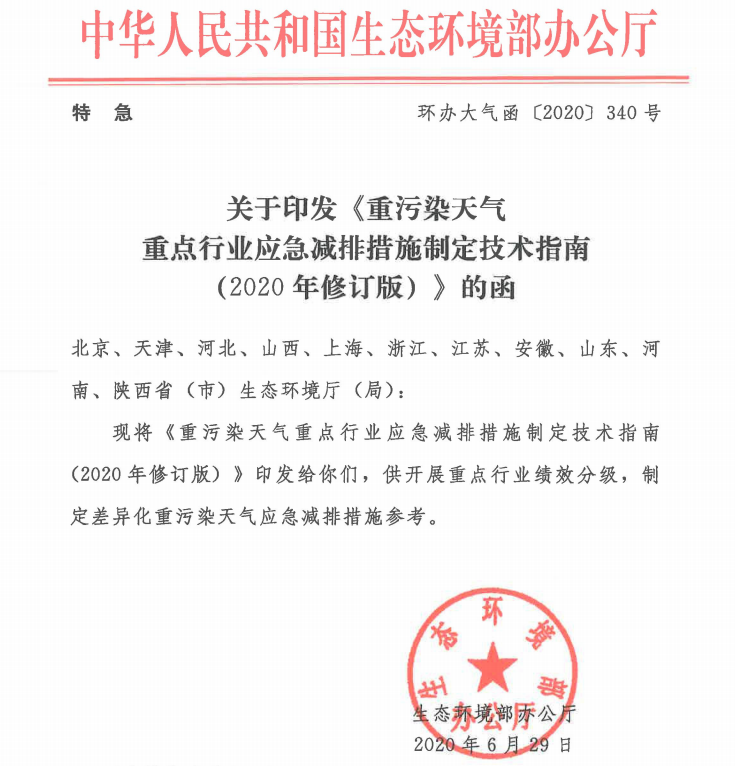 為積極有效應(yīng)對(duì)重污染天氣,進(jìn)一步突出精準(zhǔn)治污、科學(xué)治污、依法治污,保障人民群眾身體健康,中華人民共和國(guó)生態(tài)環(huán)境部辦公廳印發(fā)了《關(guān)于印發(fā)<重污染天氣重點(diǎn)行業(yè)應(yīng)急減排措施制定技術(shù)指南(2020年修訂版)>的函》(環(huán)辦大氣函〔2020〕340號(hào))