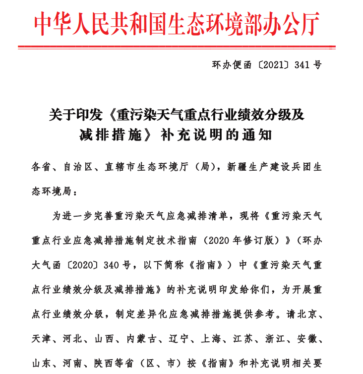 在2021年又發(fā)布了《重污染天氣重點(diǎn)行業(yè)績(jī)效分級(jí)及減排措施》的補(bǔ)充說明的通知,通知中又增加了兩個(gè)省份。